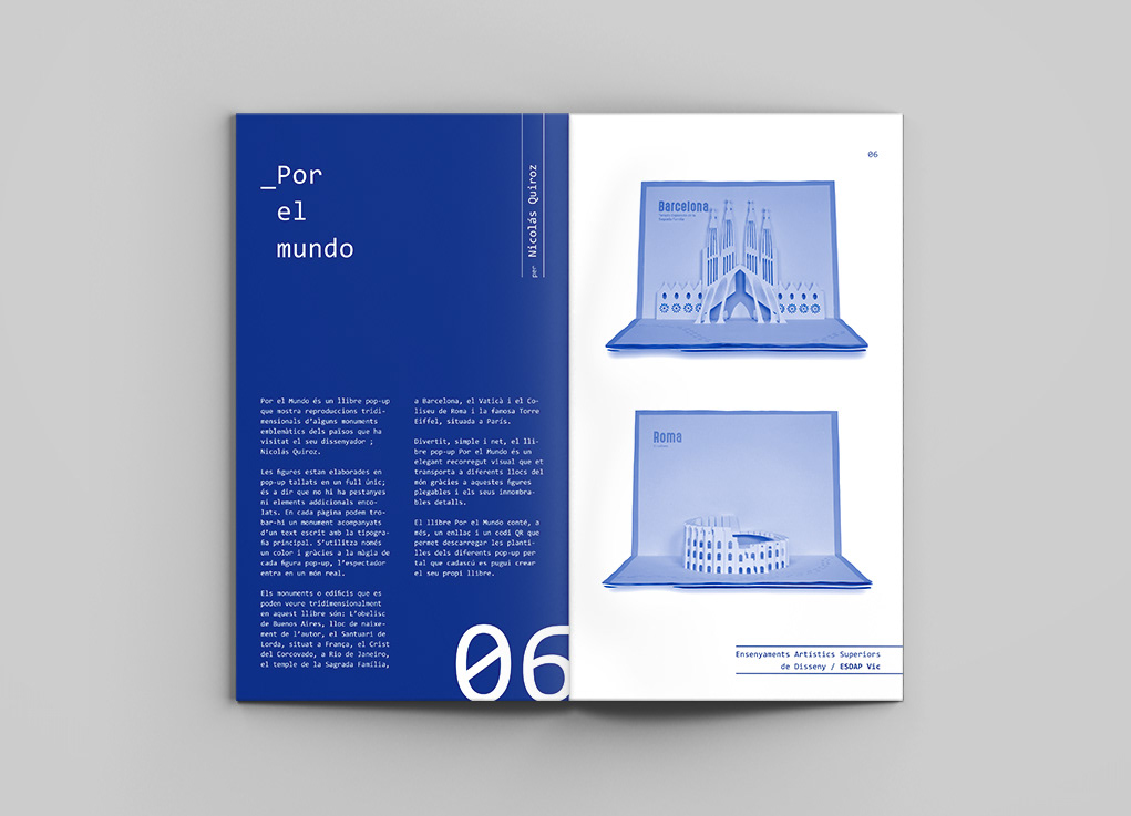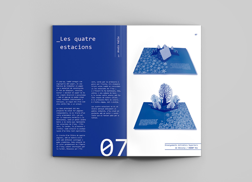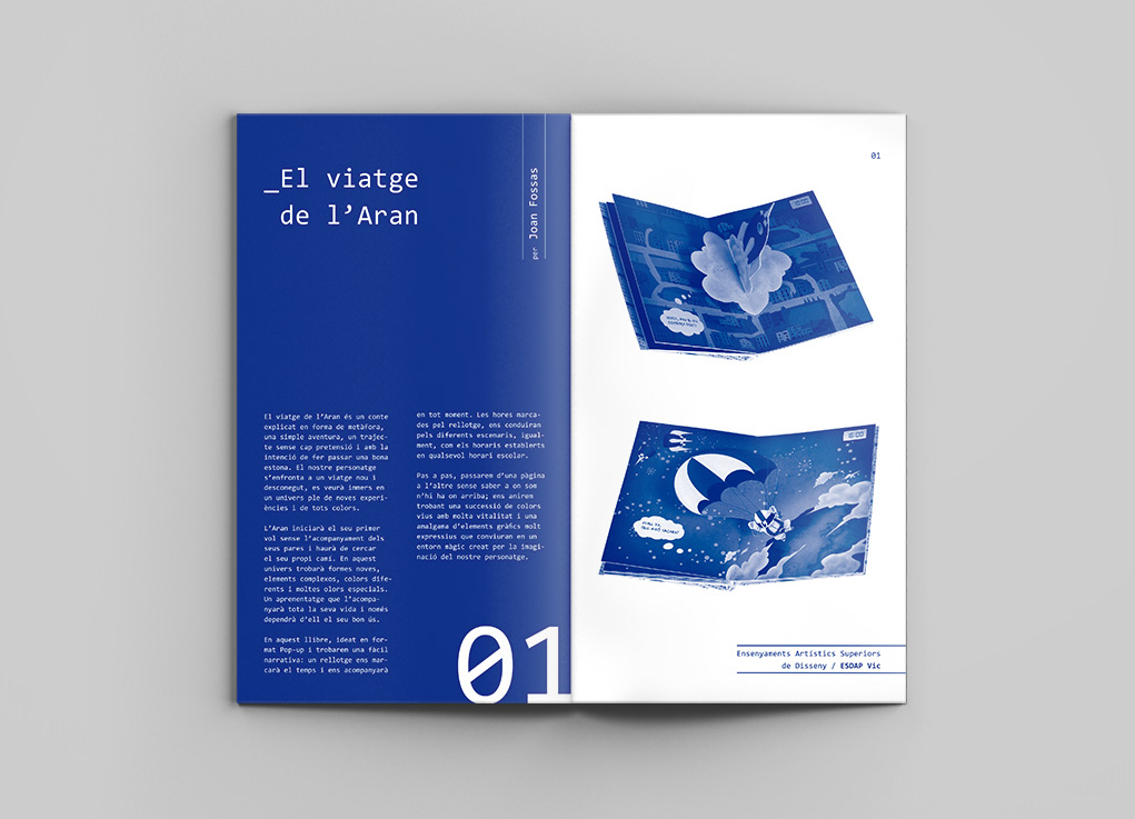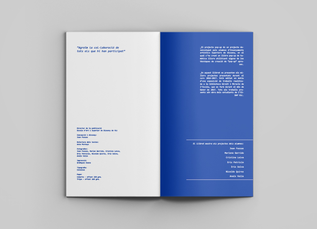 This edition presents a selection of the most outstanding projects from the 2016-2017 academic year and was published on the occasion of an exhibition held at the Giralt i Miracle Library of the Vic School of Art (Barcelona) in January 2017. The artistic direction and editorial design provide coherence and a strong visual identity, transforming the book into something more than a catalogue: an experimental object that frames and enhances the students' works within a contemporary design language.